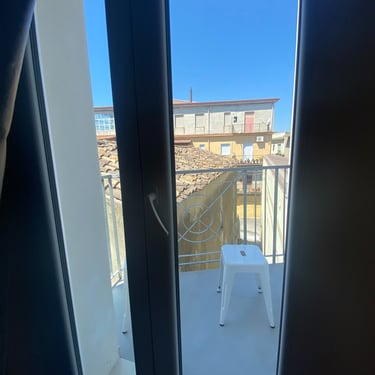 Balcone e finestra con vista sui tetti della città